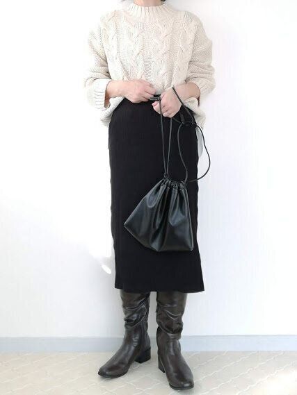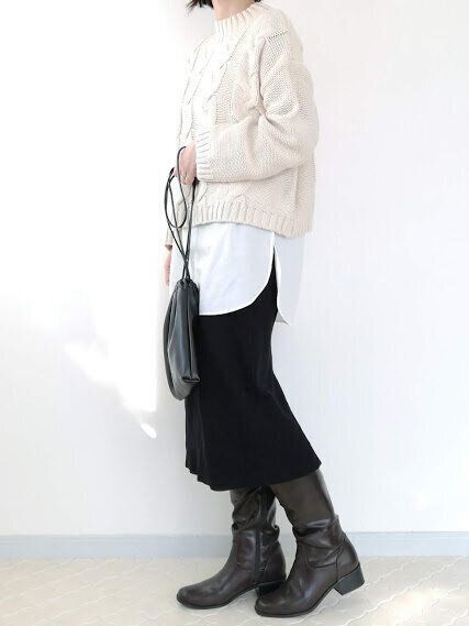 Iライン効果で、スタイルアップ効果も期待できます。モノトーンで統一することで、もっさり見えがちなケーブルニットを洗練された印象に。