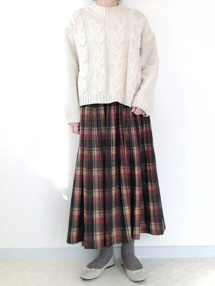 ケーブルニット×ロング丈チェックスカートのコーデ。ガーリーでほっこりした着こなしは、40代がすると「年齢不詳」なイタいおばさんに見える可能性が…。