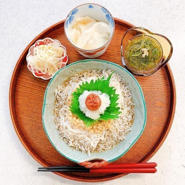 1日の献立は、たんぱく質100g、脂質40g、糖質160g、摂取カロリー1,300kcalを目安に考えています。ある日の朝食には、しらすおろし納豆そうめん、豆もやし、めかぶ、豆乳ヨーグルトを食べました。そうめんは、低糖質の商品を使っています。この日は夕食にお酒を飲む予定があったため、朝・昼をセーブしたのだとか。