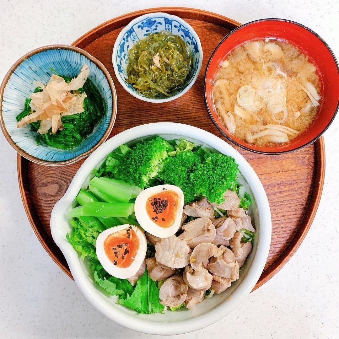 この日の夕食は、砂肝やゆで卵をトッピングしたたっぷりのサラダ、めかぶ、ほうれん草の酢あえ、きのこやわかめのみそ汁。野菜やたんぱく質がメインのヘルシーな献立ですが、糖質補給のために干し芋もプラスしたそう。カロリーや栄養素の計算には、アプリを上手に活用しています。