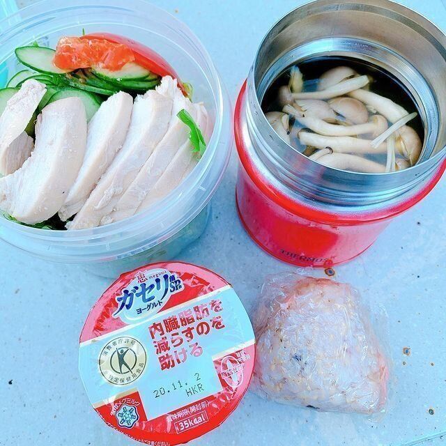 昼食は、職場に手づくりのお弁当を持参しています。この日のメニューは、玄米を使った鮭おにぎり、チキンサラダ、きのこがたっぷり入ったスープ、ヨーグルト。食物繊維や乳酸菌を含む食品をとって、腸内環境にも気を配っているようです。また、たんぱく質と糖質を補給するために、夕方の間食にはプロテインとせんべいをチョイスしました。