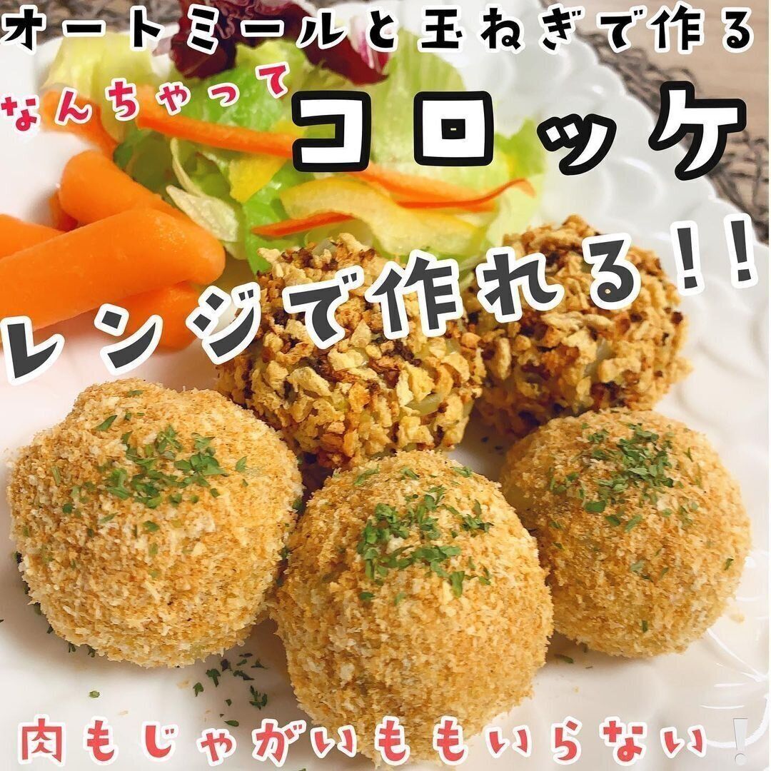 こちらはオートミールでつくるコロッケ風の料理で、1個当たり68kcalとヘルシー。玉ねぎ・オートミール・水・調味料を電子レンジで加熱し、水煮のうずらの卵を包んで、炒めたパン粉を振りかければ完成!肉もじゃがいもを使っていませんが、家族からも好評の一品だそうです。