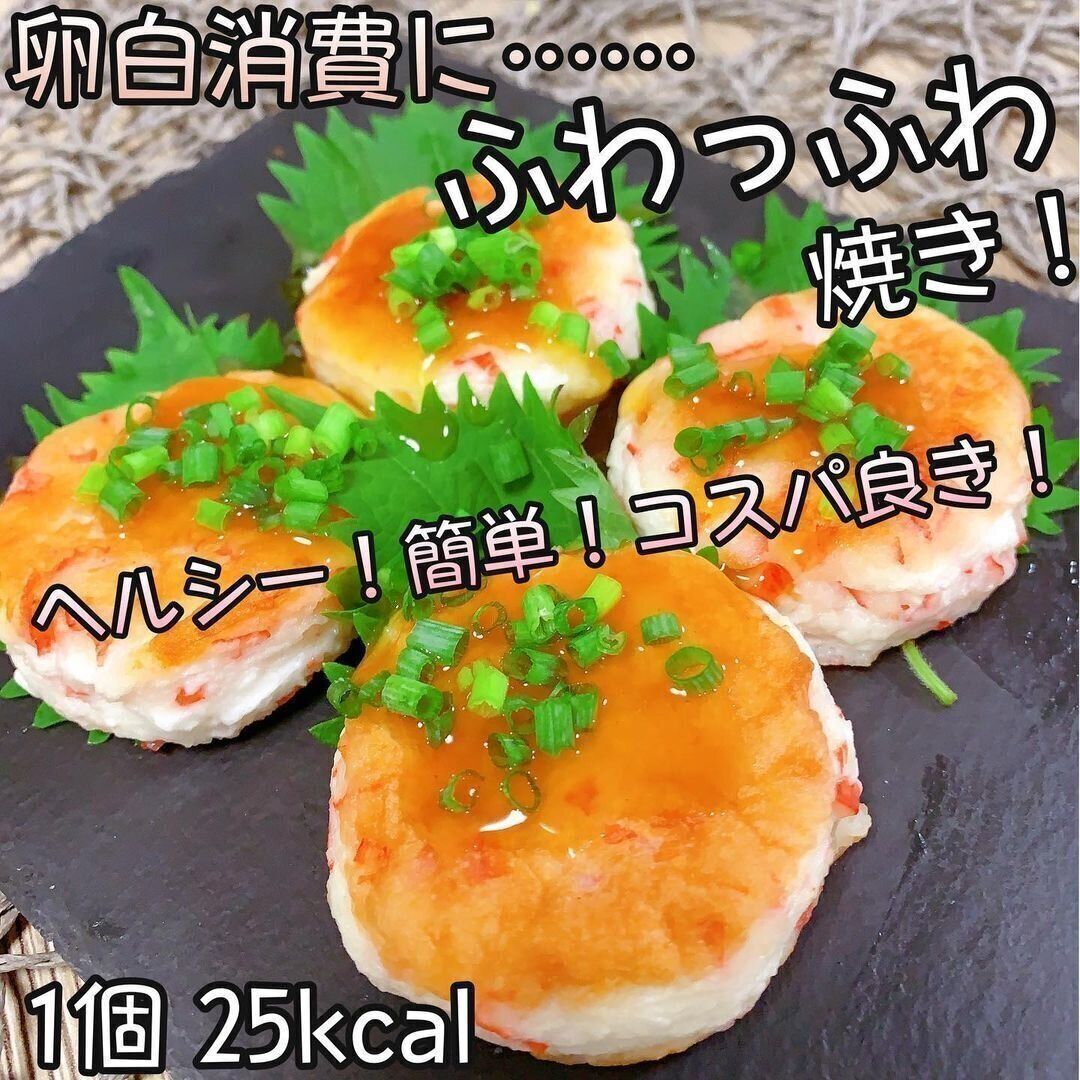 卵白とカニカマを組み合わせた、ふわふわ焼きのレシピです。卵白・はんぺん・片栗粉をミキサーにかけて、とろとろの状態にします。刻んだカニカマを混ぜ合わせ、丸く形を整えて焼いたらできあがり。1個25kcalと低カロリーで簡単につくれるので、余った卵白を消費したいときや、あともう一品ほしいというときにもおすすめですよ。
