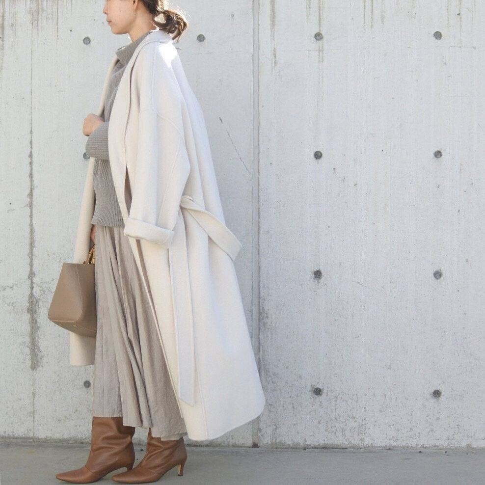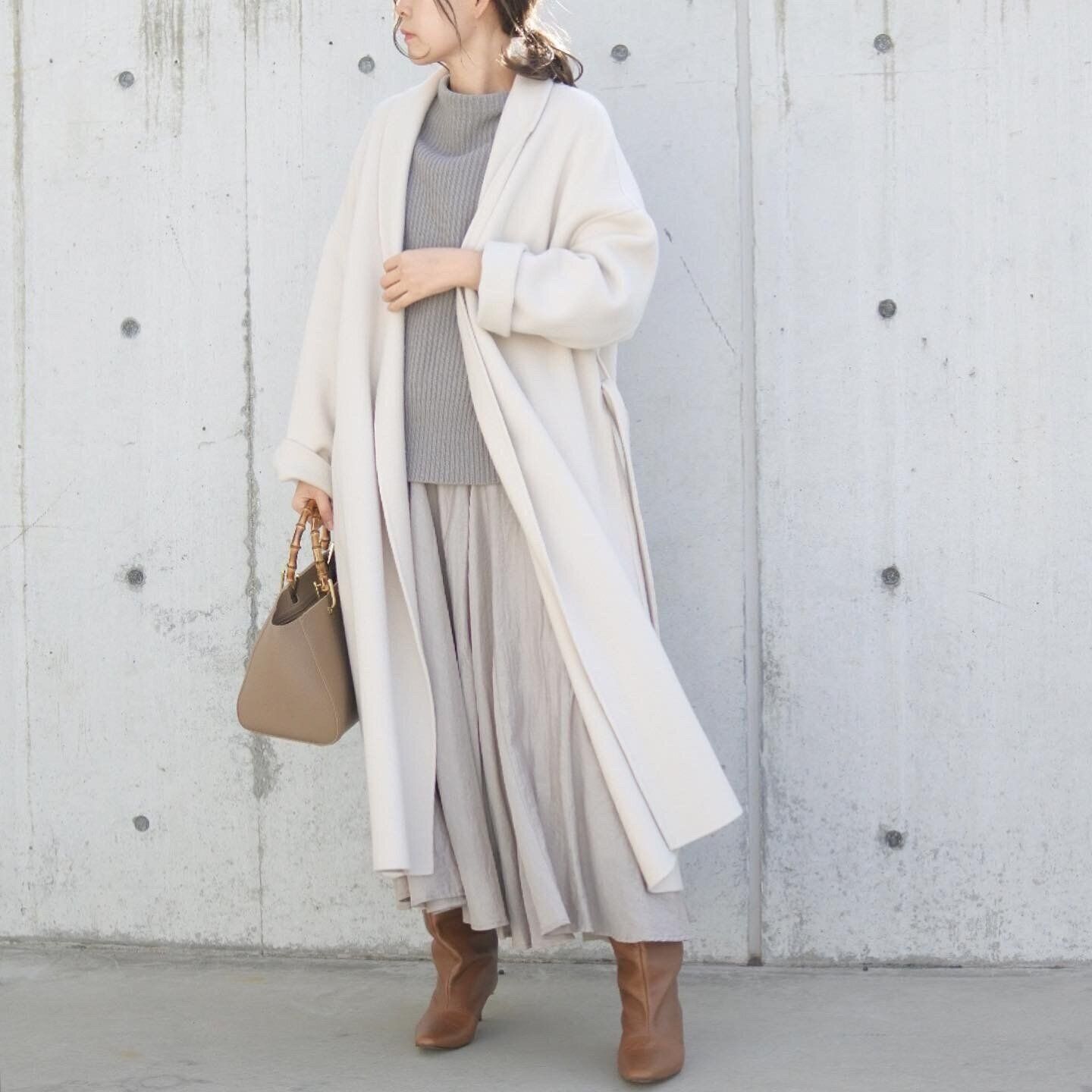 丈は思い切ったロング丈に。中途半端な丈感はスカートとの相性が悪いです。薄いベージュやグレーをチョイスすると全体が重い雰囲気にならずにすむのでオススメですよ!