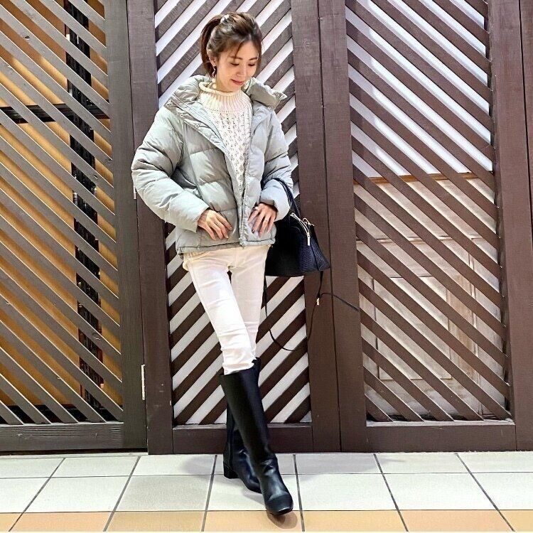 少しタイトなスカートをあわせることで、アウターのボリュームで着ぶくれすることもありません。アラフォーでも真似しやすいレディカジュアルなコーディネート。