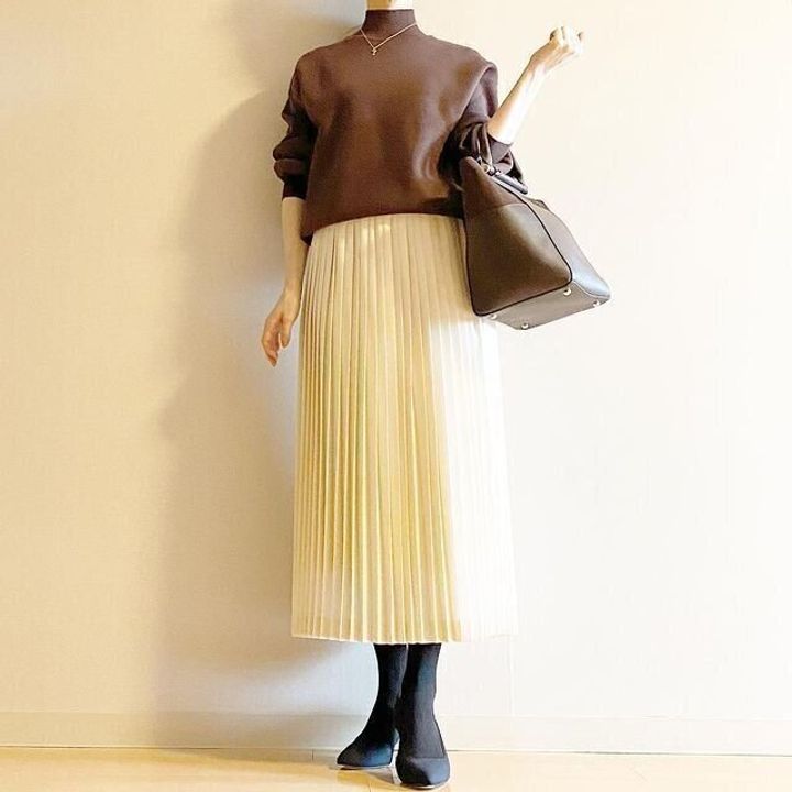 GU「スウェットライクハイネックセーター」は1,490円(2021年1月28日時点)。プチプラニットを、アクセサリーやレザーバッグなどで大人らしく格上げ!プリーツスカートを合わせて、品のあるきれいめな着こなしに。