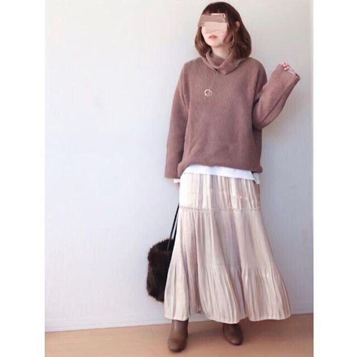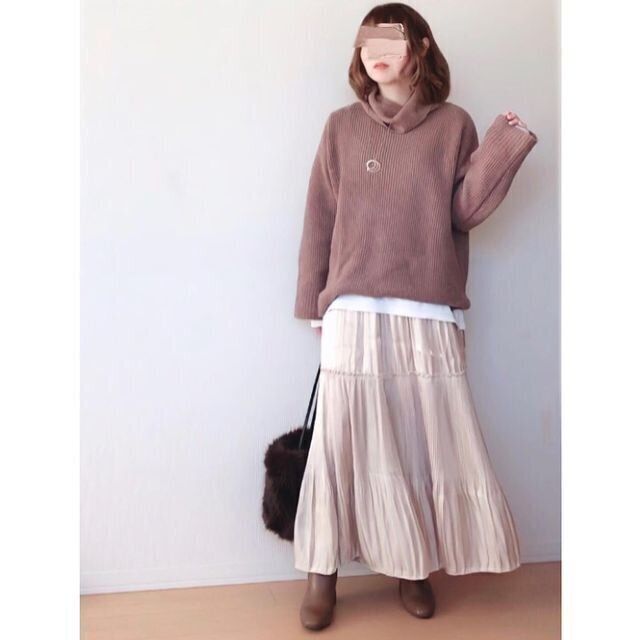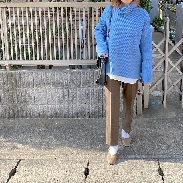 同じくGU「ボクシータートルネックセーター」を使ったコーデ。ブラウン系のワントーンでまとめた、大人かわいい着こなし。上下ともゆるシルエットで、今っぽいバランスに。