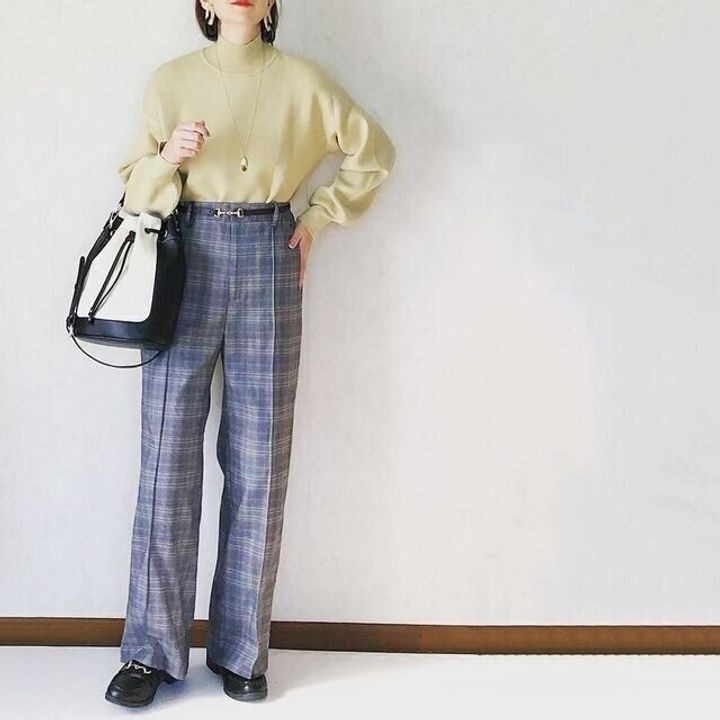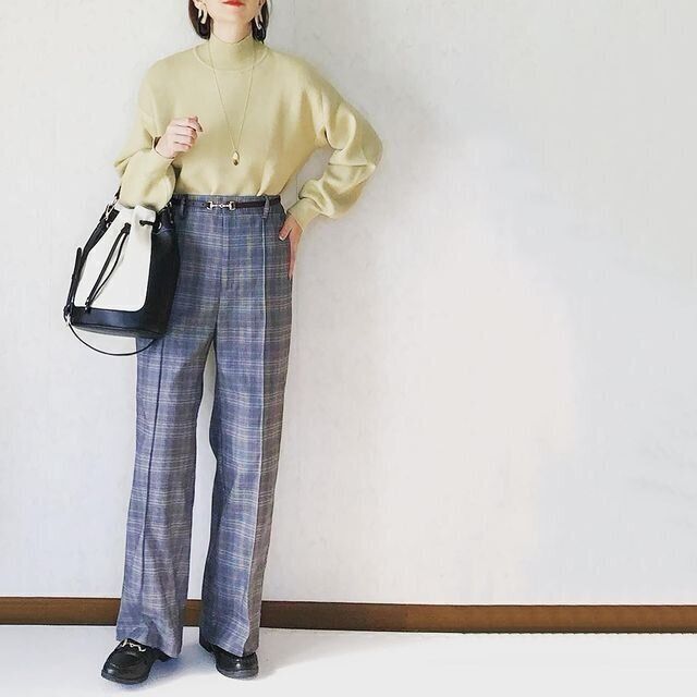 同じくGU「スウェットライクハイネックセーター」を使ったコーデ。チェックパンツと合わせてマニッシュに。やさしいたまご色のニットで、カラーから春を先取り。