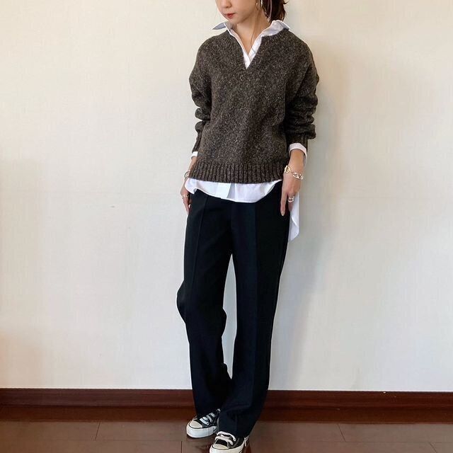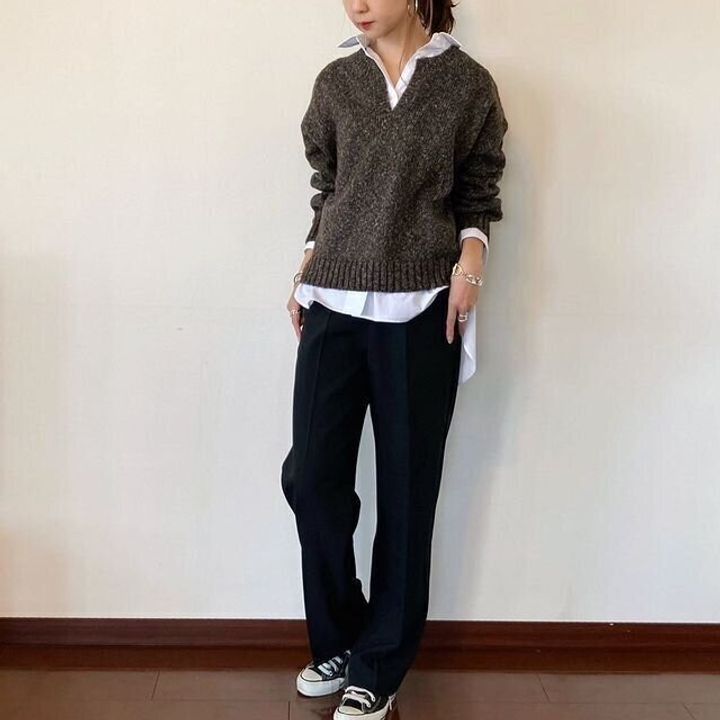 同じくGU「メランジキーネックセーター」を使ったコーデ。えりつきシャツをレイヤードすると、きちんと感ある着こなしに。お手本にしたい、好感度大な大人カジュアルコーデです。