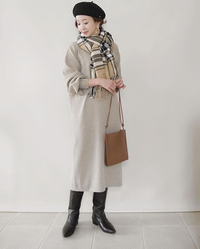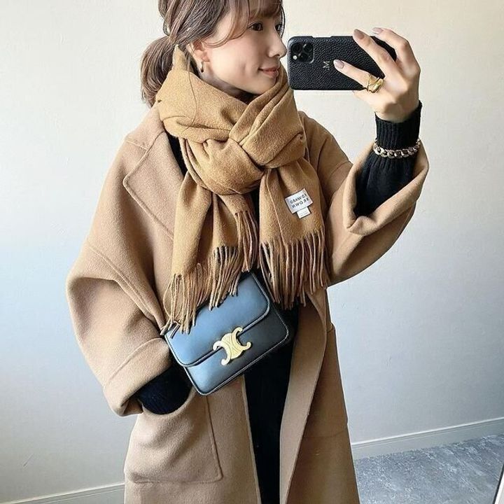 同じくキャメルのコートに合わせて、まとまりある印象に。ブラックと相性がよく、洗練された着こなしに見せてくれます。トレンドの「ミラノ巻き」なら、今っぽさも演出できて◎。