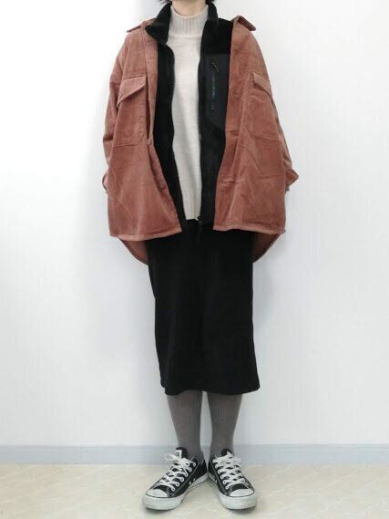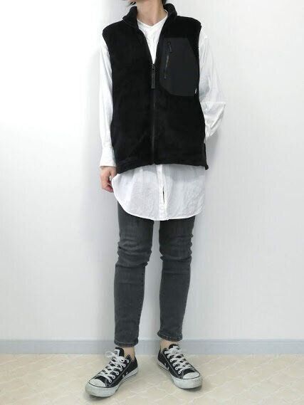 旬なバンドカラーシャツにON。モノトーンでそろえることで、カジュアルコーデが大人らしくまとまります。ファスナーを開けてVネックゾーンをつくると、よりすっきりと着こなせて◎。