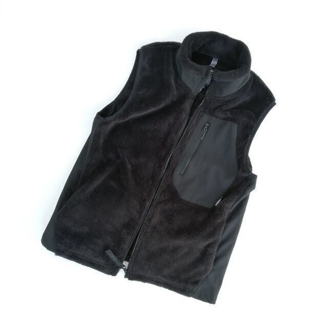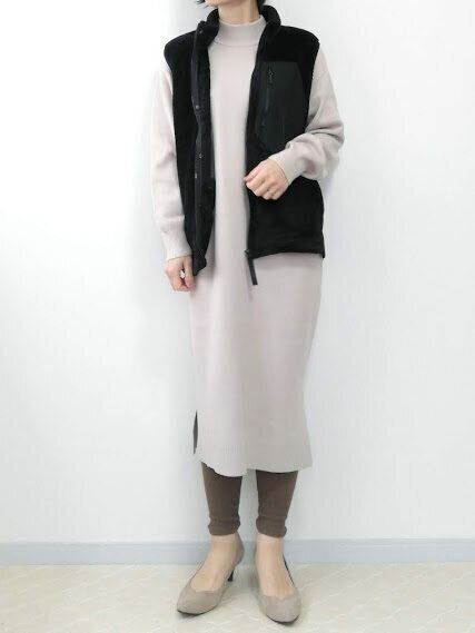 アウトドアテイストのフリースベストに、きれいめなニットワンピースがミスマッチ…。
