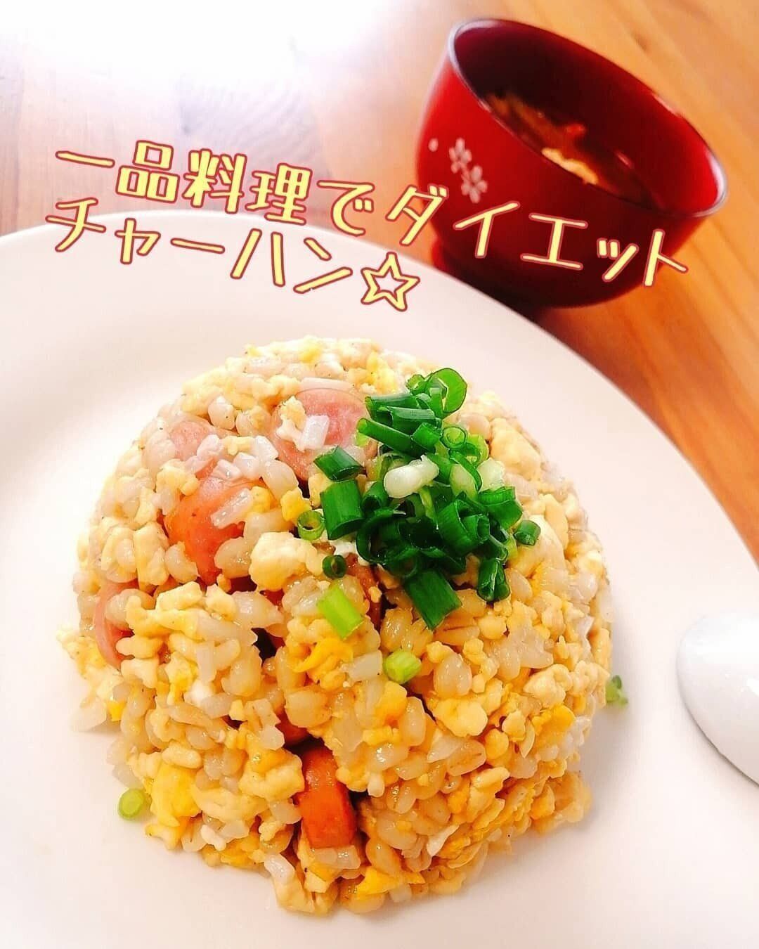こちらは、豆腐ともやしでかさまししたダイエットチャーハン。まず、こまかくつぶした豆腐をフライパンで炒り、水分を飛ばします。米粒サイズにみじん切りしたもやし、もち麦と混ぜて、好みの具材と味つけでチャーハンをつくれば完成!