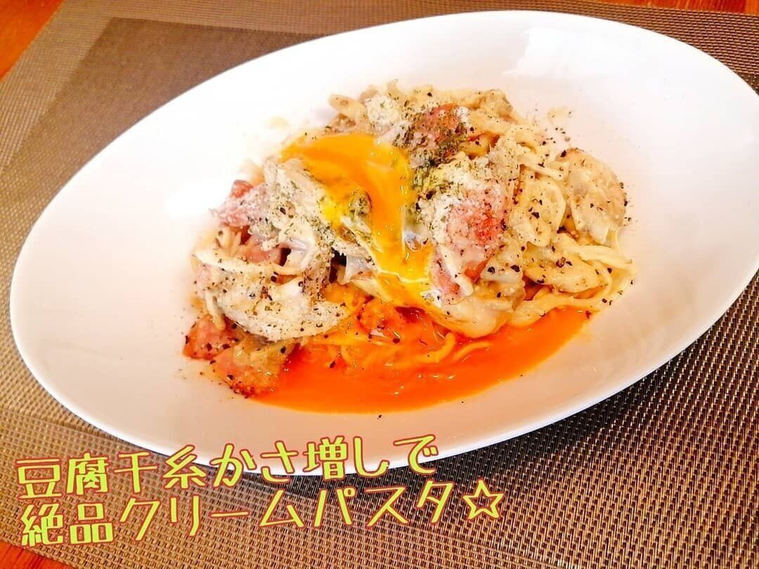 こちらは、濃厚なクリームチーズパスタを低糖質で楽しめるレシピ。中国の豆腐干絲(トウフカンス)という食材を使って、パスタの麺をかさまししています。豆腐干絲は豆腐の麺のようなもので、糖質ゼロ麺と違って食べ応えも食感もあるのだとか。パスタの具材はきのこをえらんで、よりボリューミーに仕上げると◎。