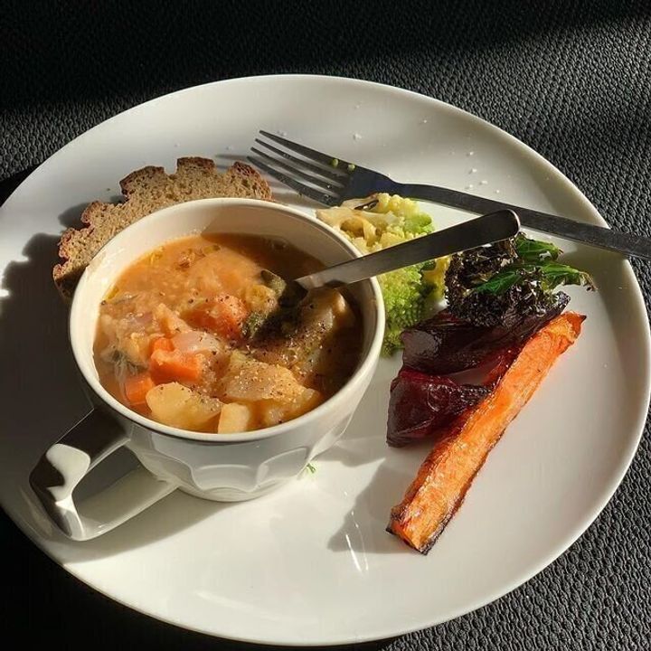 ある日の夕食では、体に優しいミネストローネをつくりました。野菜のカット方法や煮込む順番にこだわると、うま味をより引き出せるとのこと。そうすることで、動物性のタンパク質やブイヨンを加えなくても、塩だけのシンプルな味つけでおいしく仕上がります。