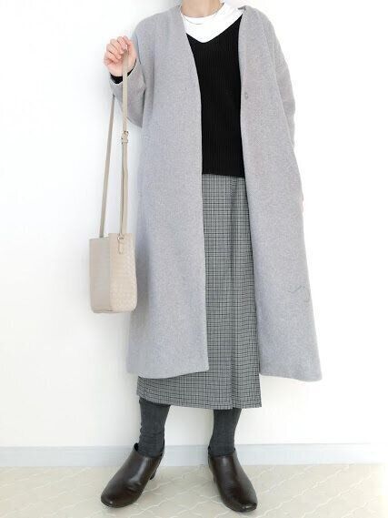 まだ気温が低い日には、コート合わせで防寒したいもの。すっきり見えて今っぽい、トレンドのノーカラーロングコートと相性◎。インナーもVネックにすることで、着痩せ効果も狙えます。