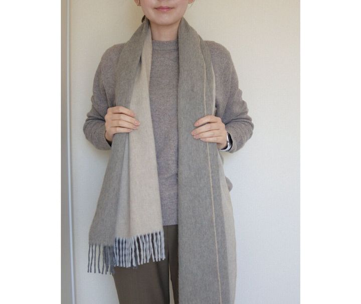 ストールだけ違うカラーをつけるのもポイント使いとしてはありですがやや幼稚なイメージに。
