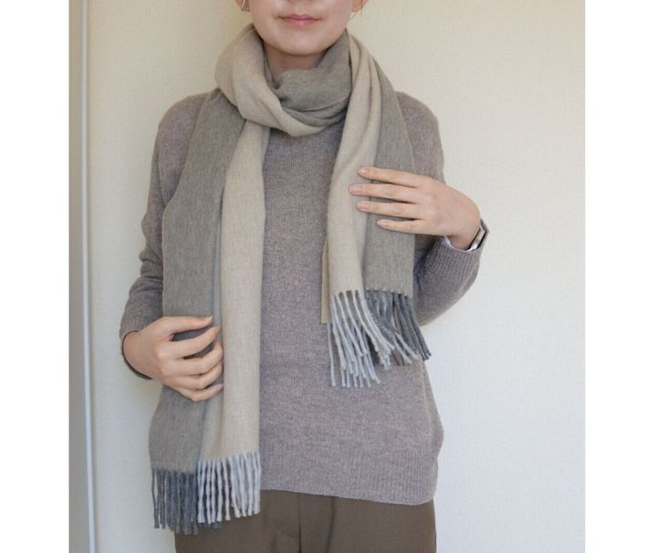 私がいちばん使う巻き方です。どんなコーデとも合わせやすく、前で2回クロスするのでしっかり暖かいです!