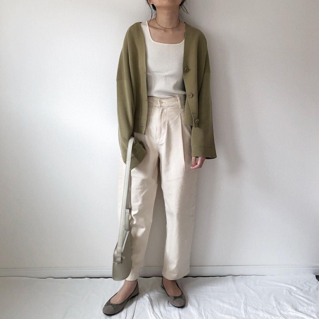 「ミラノリブVネックカーディガン」で上半身をコンパクトに
