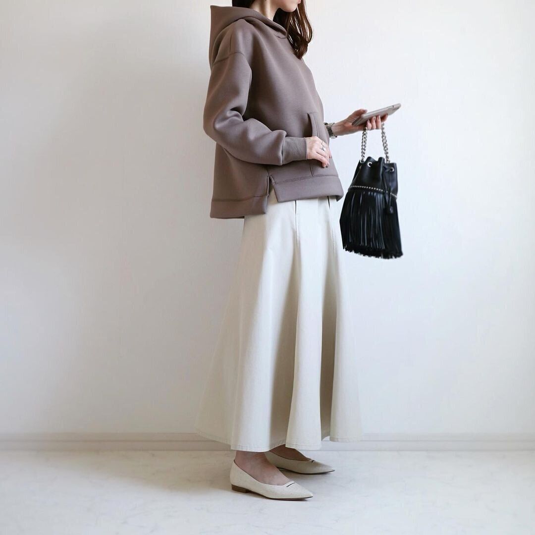 Uniqlo Uのスカートの中で一番人気があるのがこちらの「コットンツイルフレアスカート」(3,990円)です。贅沢に生地を使い、ドラマティックな広がりあるシルエットを実現。ゆるっとしたスウェットでカジュアルに着崩すのが気分です。フェミニンとカジュアルのバランスがよく、スカートを履いていても「張り切りすぎ」に見えません。