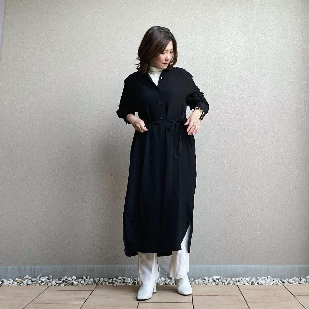 「シャイニーレーヨンロングシャツワンピース(長袖)」(4,990円)は、光沢感があり上品な印象をメイク。羽織ったり、パンツとレイヤードさせるなど着回し力が高い1枚です。共用のベルトつきなので、ウエストをキュッと結ぶときれいめコーデにも転身。カジュアルにも上品にも着回せるふり幅の広さが自慢です。
