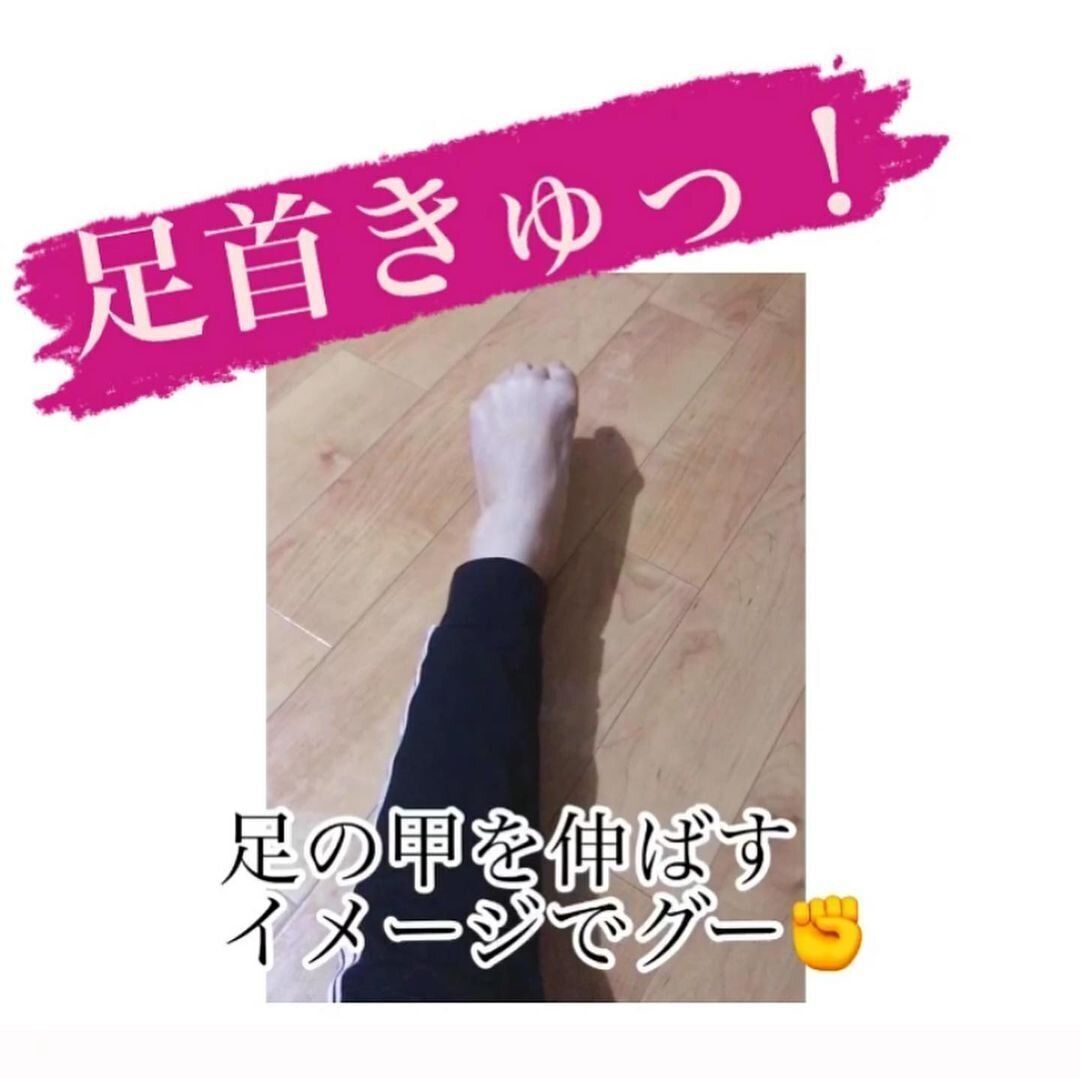 こちらは、足首を引き締めるためのトレーニング。ひざ下を伸ばして座り、足の甲を伸ばすようなイメージで足をグーにします。足首は曲げずに、つま先を遠くに引っ張るイメージで動かしましょう。土踏まず付近がつりやすいので、足の指をほぐしてから行うと◎。