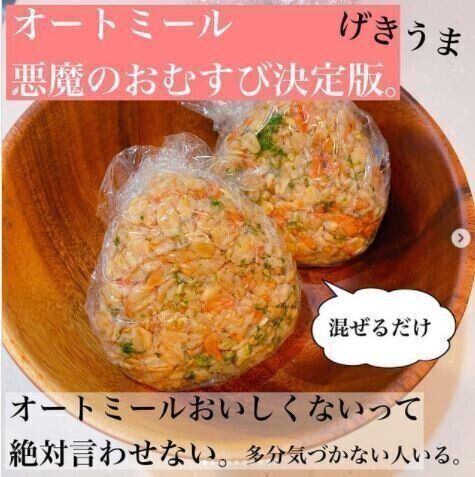 オートミールを使ったメニューや低糖質のおかずで、6kgの減量を達成中のdietobentoさん。この日は、オートミールでおむすびをつくりました。作り方は、水と麺つゆでふやかしたオートミールに天かす・桜えび・ゴマ・青のりを入れて混ぜるだけと至ってシンプル。塩昆布やかつお節・高菜などでアレンジしてもおいしそうですね。