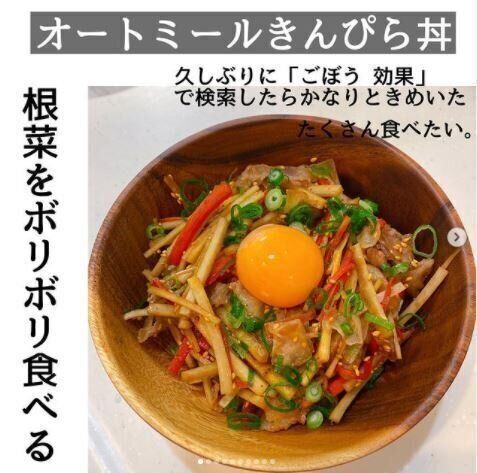 千切りのごぼうとにんじんに、好みで豚バラやミンチなどの肉を加え、しょうゆ・甘味料・ごま・一味などと炒めてきんぴらにします。丼にふやかしたオートミール、きんぴらをのせて、ネギと卵黄をトッピングすれば完成。ごぼうとにんじんはあらかじめ電子レンジで加熱しておくと、時短になりますよ。
