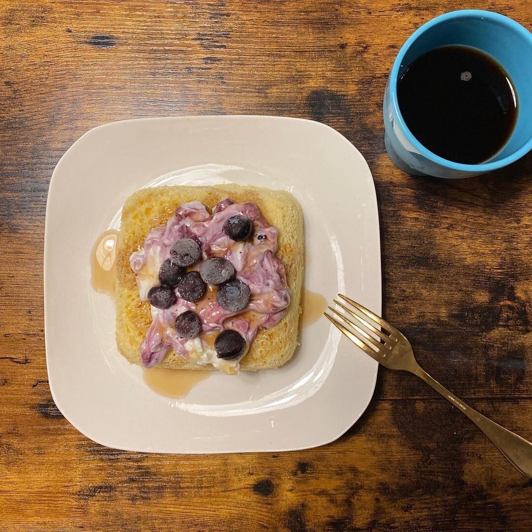 昼食の時間が遅くおなかがすかなかった日は、おから蒸しパンで軽めの夕食をとりました。高たんぱく・低カロリーなヨーグルトとブルーベリーをトッピングし、ゼロカロリーのシロップもプラス。軽食やおやつにもよさそうなメニューです。
