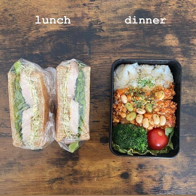 この日の昼食は、低糖質なブランパンに鶏ハムをはさんだサンドイッチ。夕食は、玄米と白米に鶏胸肉のトマトソースをかけたメニューでした。どちらもヘルシーで食べ応えがあり、たんぱく質をしっかりとれる献立になっていますね。