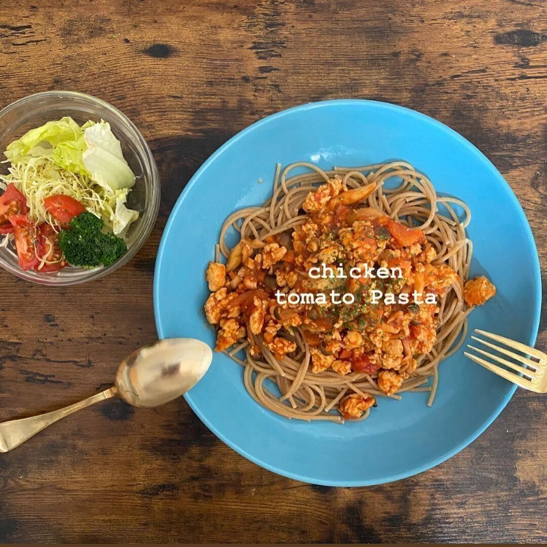 別の日の昼食は、全粒粉のパスタを使ったレシピに。鶏胸肉のトマトソースをかけて、カフェのようなおしゃれな一品に仕上げています。朝食はオートミールに牛乳を加えたオートミールポリッジ、夕食はオートミールをクッパ風にアレンジしたものと、ダイエット食材を上手に活用しているようです。