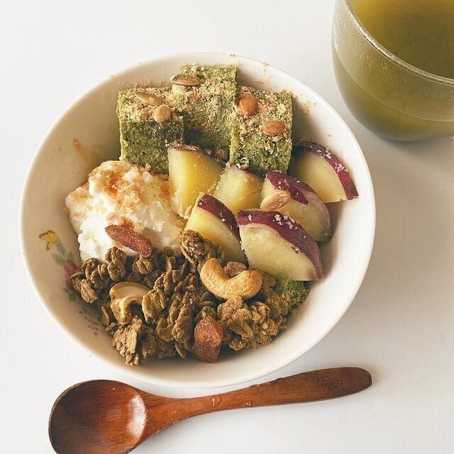この日の朝ごはんには、グラノーラをチョイス。ボウルにほうじ茶味のグラノーラ、ヨーグルト、さつまいも、抹茶プロテイン入りの蒸しパンをたっぷり盛りつけました。仕上げにきな粉をふりかければ、和風パフェのようなおしゃれなスイーツの完成です。