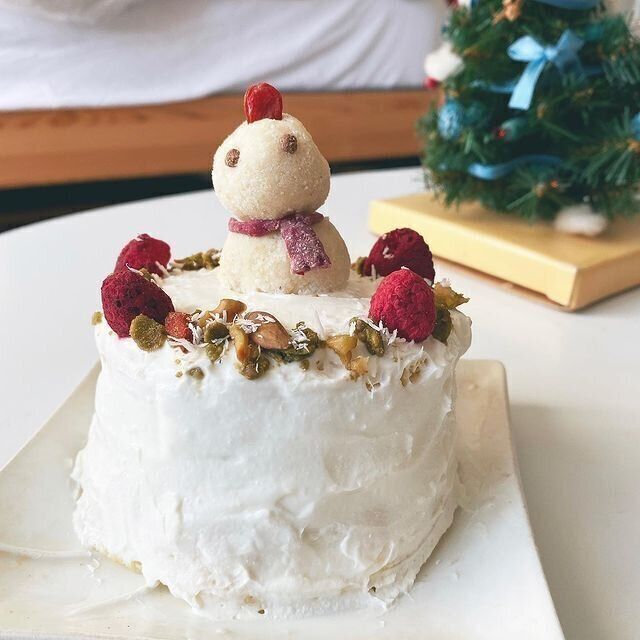 クリスマスなど特別なイベントの日のデザートも、手づくりに挑戦。こちらは無糖のヨーグルトを使ってコーティングした、おからのシフォンケーキです。上にのっているスノーマンも、おからパウダーやココナッツパウダーなどでつくっています。ケーキの中には、ラムレーズンとクリームチーズを練ったフィリングをはさんでいるそう。