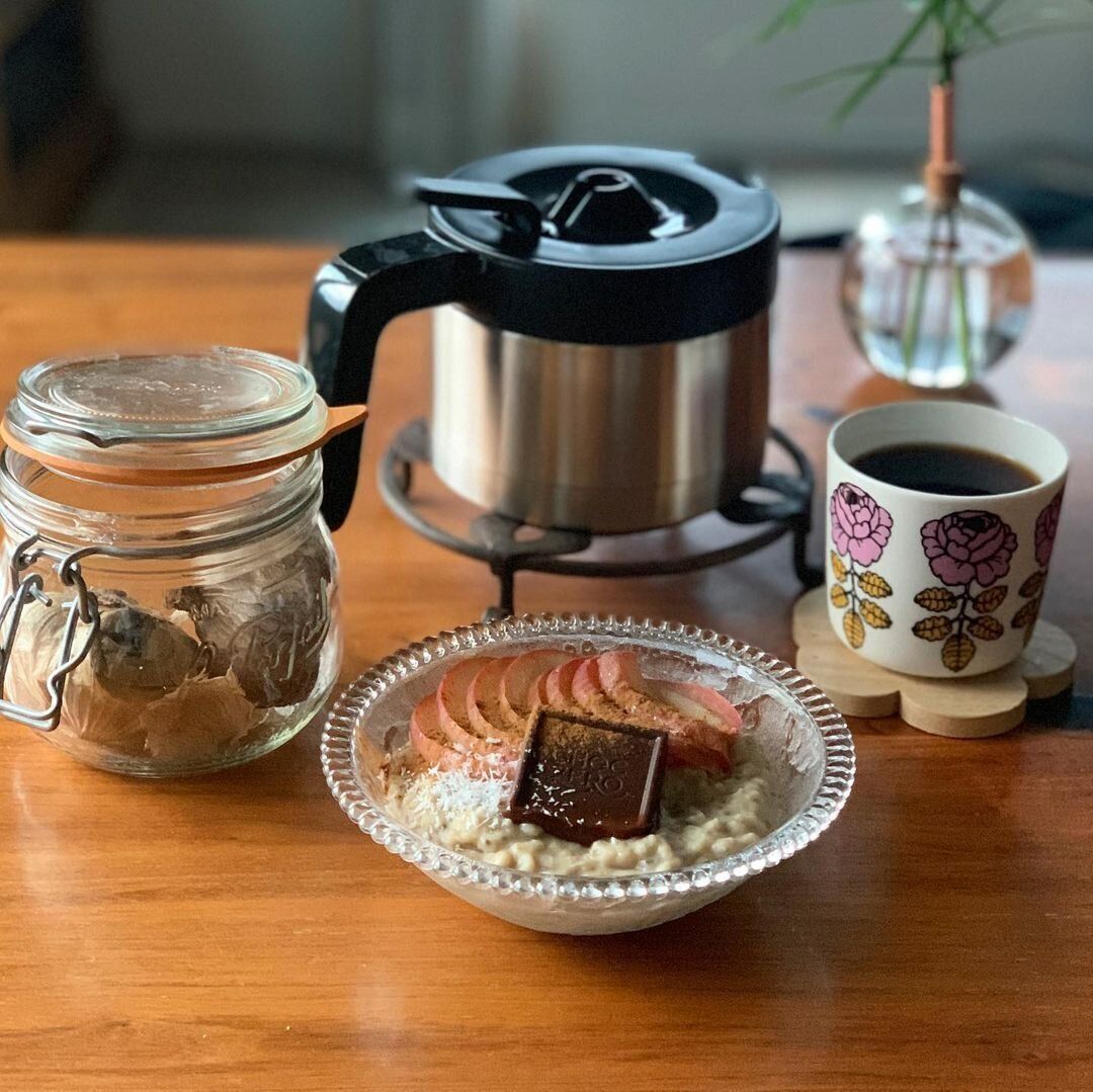 朝ごはんによく食べている、オートミールポリッジ。この日はチアシード、プロテインを入れて、シナモン、ココナッツパウダー、レンジで加熱したりんごをトッピングしました。さらに、アイハーブで購入したシュガーフリーのチョコレートをプラスすれば、チョコ好きにはたまらない一品に。