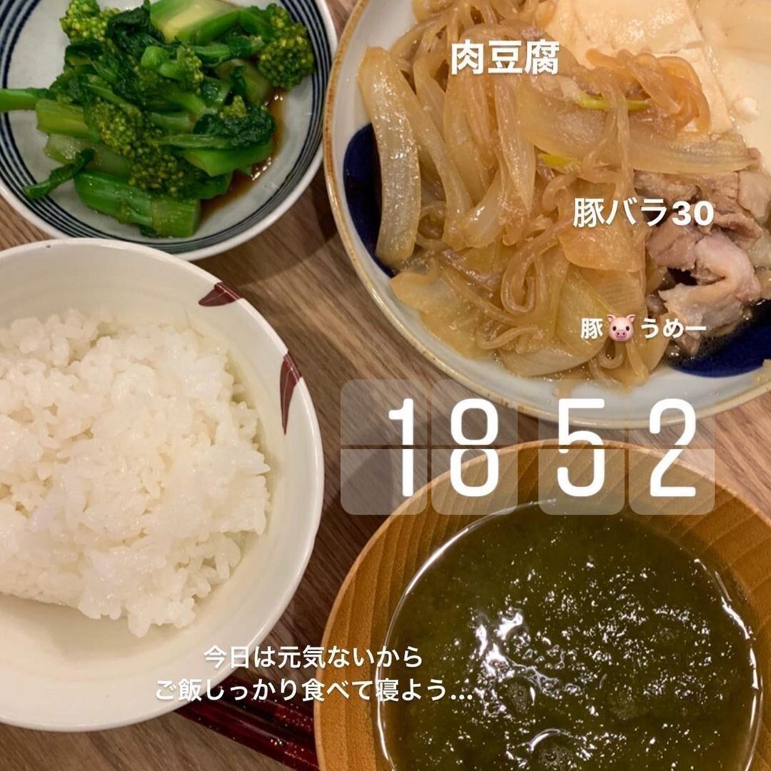 ダイエット中でも、眠気や疲れを感じたらしっかりごはんを食べるようにしています。この日は、豚バラ肉でつくった肉豆腐と白米を食べました。それから、股関節のストレッチや入浴を済ませて、ハーブティーを飲んでぐっすり眠り、スタミナ回復に努めたようです。