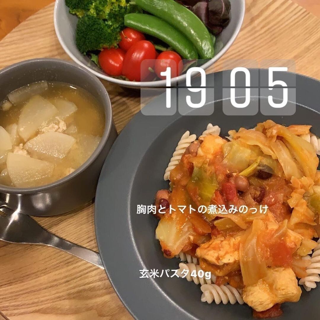 鶏胸肉やトマトなどを煮込んだソースを玄米パスタの上にのせた、ヘルシーなアレンジレシピ。ダイエットしていない家族の分は、ケチャップと豚肉を増量してつくればこってり味に仕上がるため、家族みんなが満足できるダイエットメニューなのだとか。