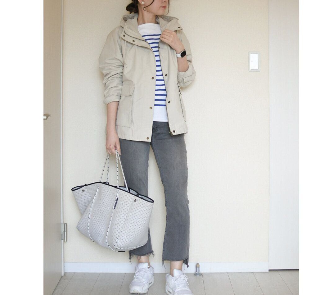 子どもと公園に行くときはボーダーやデニムと合わせてカジュアルに。デニムはネイビーよりグレーを選ぶと今年らしく、ほっこりカジュアルに見えるのを防ぎます。