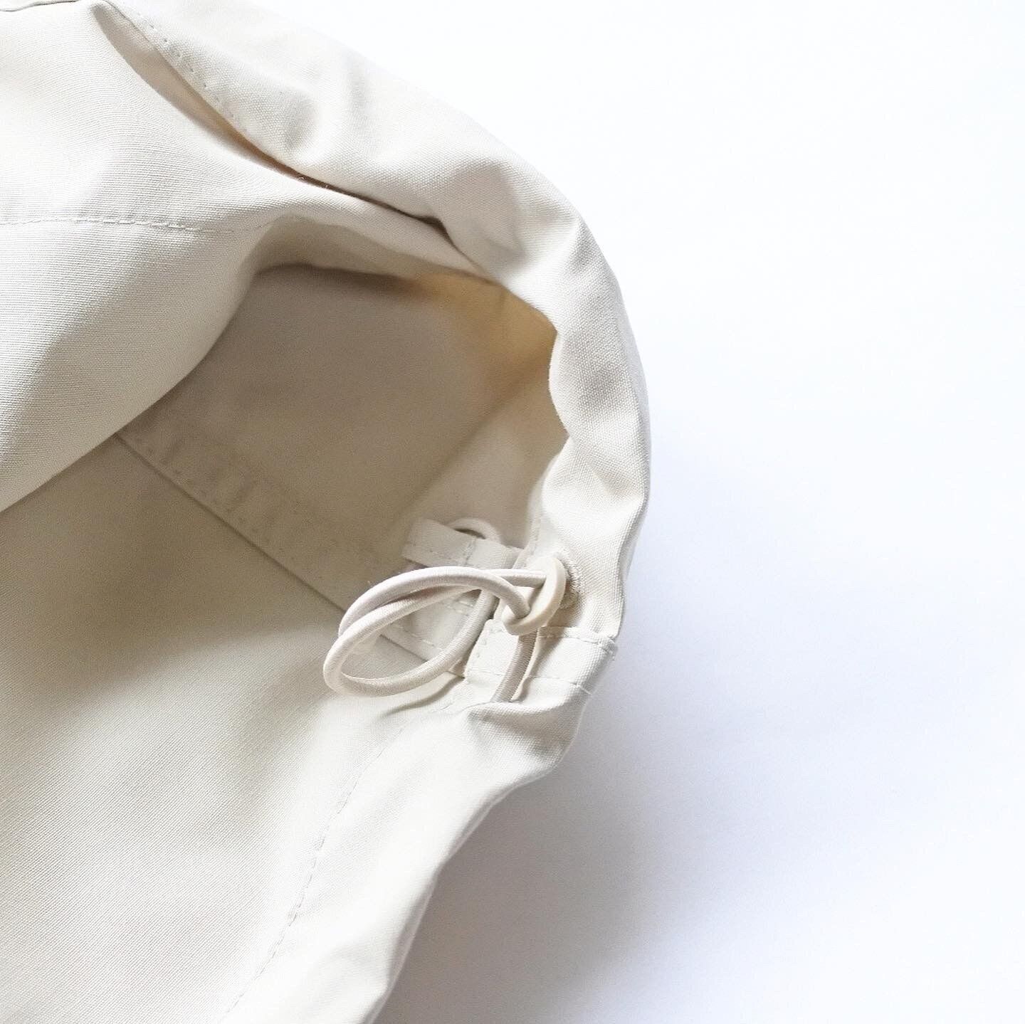 引っ張るとふんわり丸いシルエットに。スカートやワインドパンツなどボトムにボリュームが出るときは裾を絞るとバランスよく着られます。