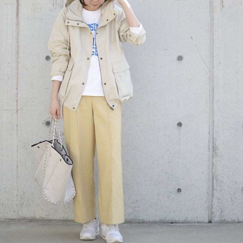 まだ肌寒い今の時期はスウェットやニットと合わせて。カラーボトムを合わせると春らしく、いつものコーディネートをブラッシュアップしてくれます。