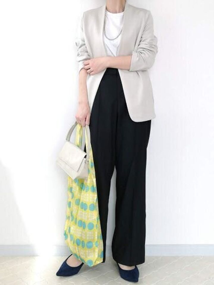 アラフォーはスモーキーな色合いがときとして「地味見え」することもあるので、きれい色のエコバッグをアクセントとしてプラス。
