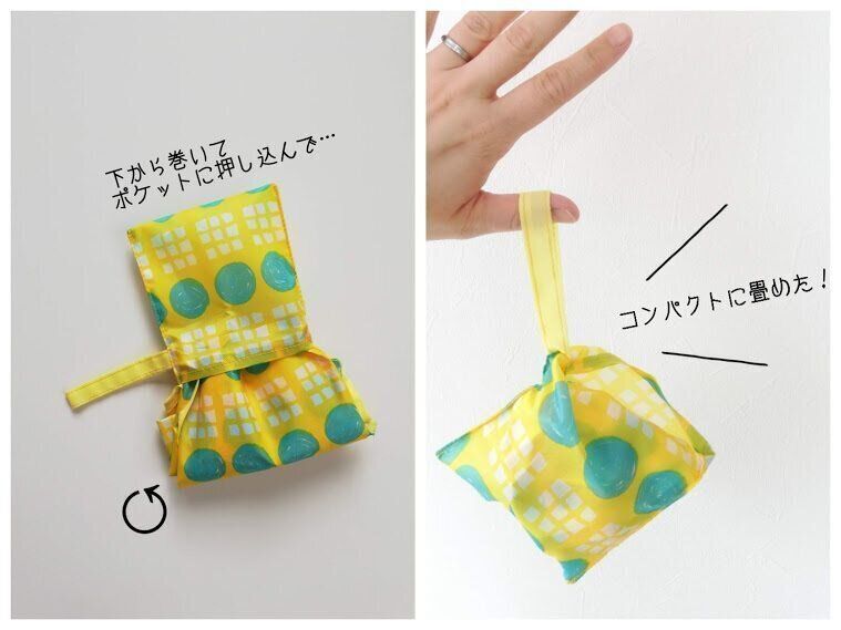 上記の画像の手順で畳むと、きっちりときれいに畳めますよ。畳み終わったときについている「取っ手」の部分を、カラビナでふだん使いのバッグにつけておくのがイチオシの持ち運び方です!