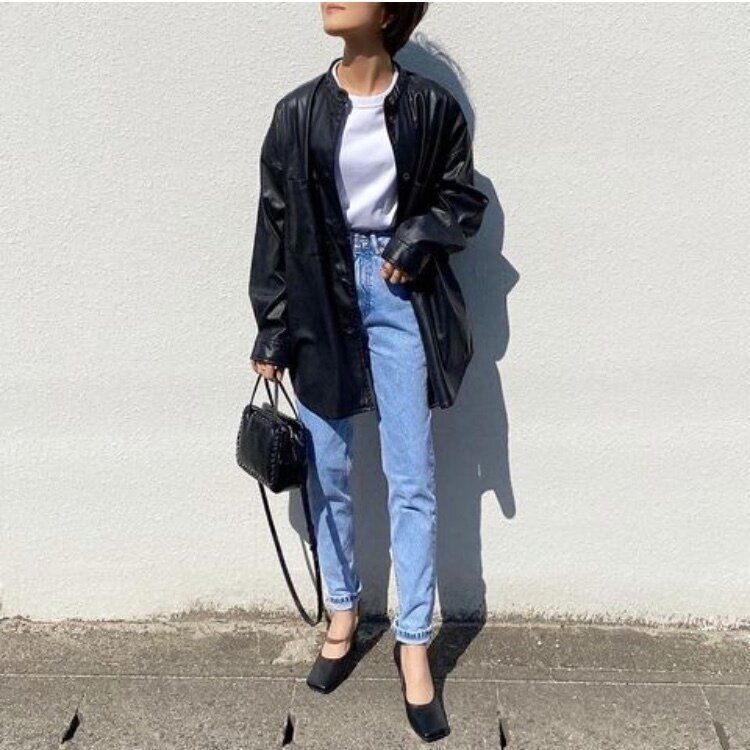 エコレザーのジャケットとも相性がいいクルーネックT。エコレザーのジャケットは今季流行のアイテムですが、オシャレ初心者には少しハードルが高いアイテム。