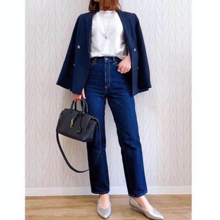 デニム×ジャケットのハンサムコーデにもピッタリのクルーネックT。