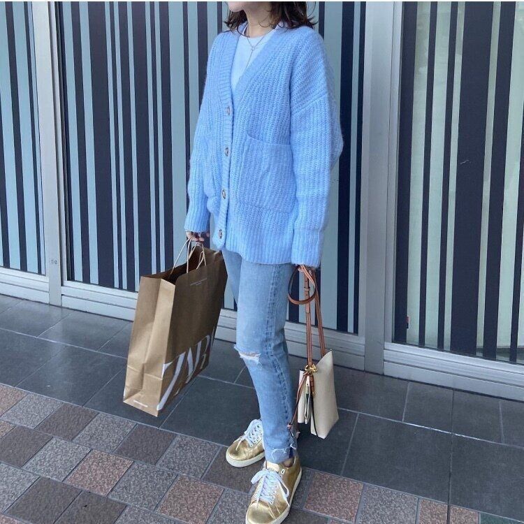デニムも淡いカラーを合わせることで、春らしい明るいカラーのコーディネートに。