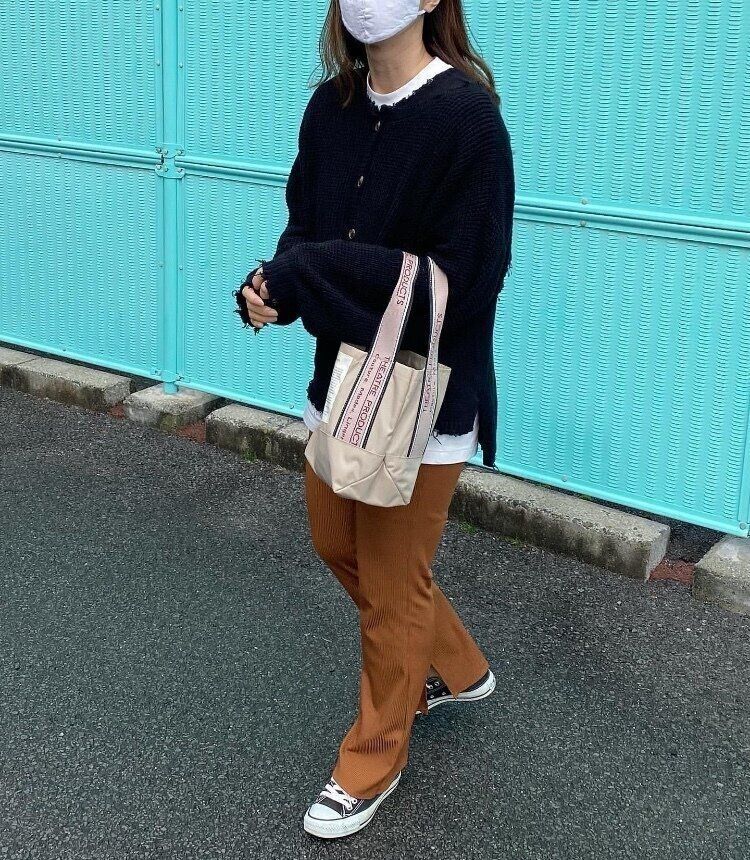ニットとパンツだけでもかわいいコーディネートですが、クルーネックTをプラスしチラ見せレイヤードすることで、ワンランク上の垢抜けコーデが完成します。