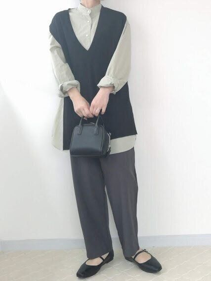 ベストをレイヤードして、旬なレイヤードコーデに。ベストを重ねるときは、ボタンを全部とめて着ると今っぽいバランスに。