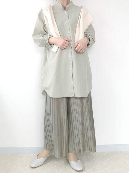 チュニック丈のバンドカラーシャツは、今から初夏まで長く着回しが楽しめるのがうれしいポイント。着回しを4パターンご紹介します。