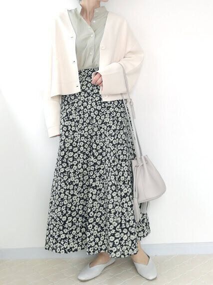 肌寒い日は、気軽に羽織れるカーディガンをプラス。重く見えないように、シャツのボタンは少し開けるのがおすすめ。