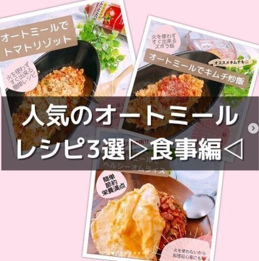 ダイエット中の食事管理に、オートミールも活用しています。オートミールを使えば、トマトリゾットやキムチチャーハン、オムライスなど、さまざまなメニューをヘルシーに仕上げられるのだとか。どれも火を使わずに電子レンジでつくれて、洗いものが少なくすむのもうれしいですね。