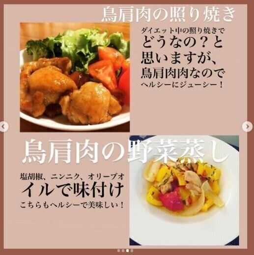 メジャーなダイエット食材といえば、鶏胸肉がありますよね。しかし、鶏胸肉は調理方法によってはパサつきがちなため、鶏の肩肉をチョイスするようにしているそう。